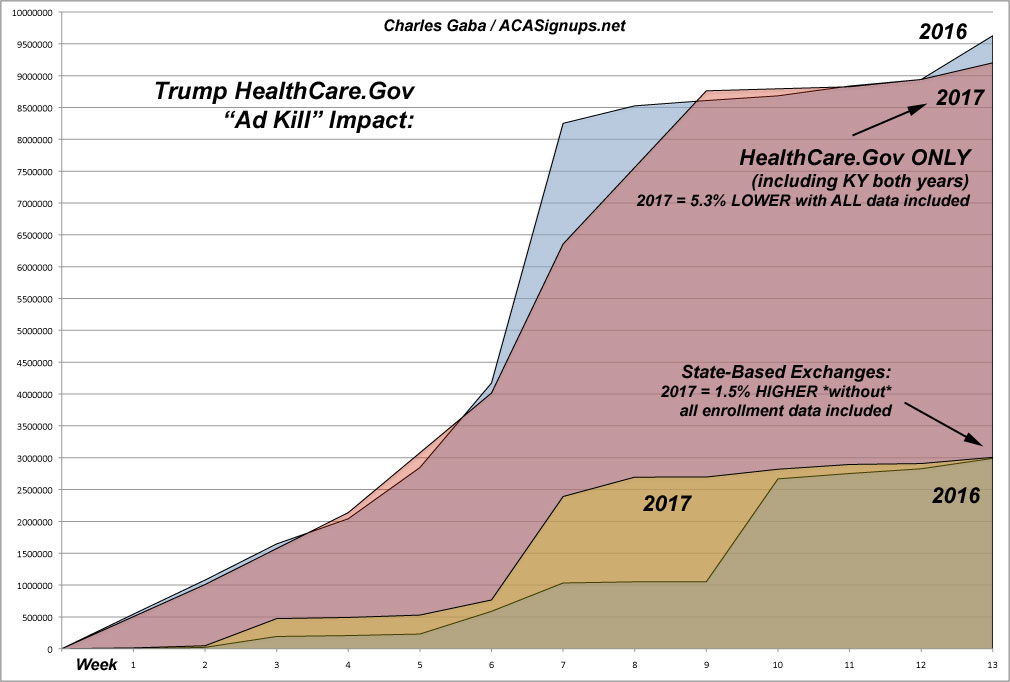 As I noted last Friday, there's pretty good evidence that the Trump administration killing off most of the final HealthCare.Gov open enrollment deadline TV ads was directly responsible for a significant portion of the OE4 enrollment reduction on the federal exchange. The most obvious evidence of this is that in the final, critical 5 days of the period (when there's always been a significant spike in last-minute enrollees), the state-based exchanges (which run their own marketing campaigns) saw a 1.5% enrollment increase (at least 44,000 people) at the same time that HC.gov enrollment fell by 5% (450,000 people) short. This discrepancy between the state exchanges and the federal one will become a bit larger once the final enrollment numbers from CT, DC, ID, MA, MN, RI & VT come in.