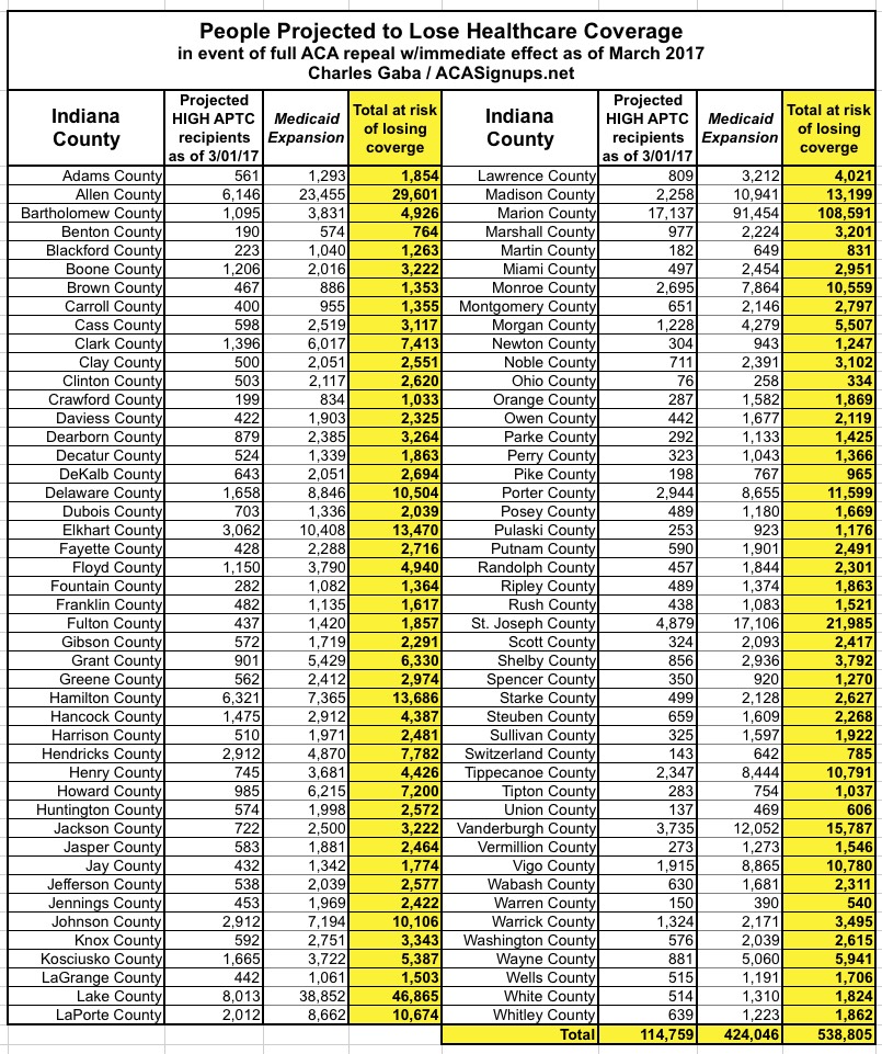 UPDATE: Indiana: Here's the 538K who could lose coverage, by County and Congressional District