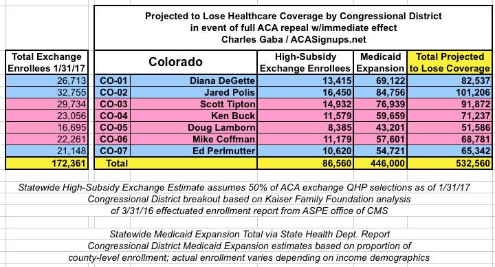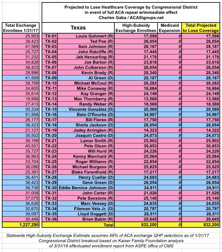 MAJOR UPDATE 3/22/17: As I've noted repeatedly, my estimates of how many people are at risk of losing their coverage has always been based on the assumption of full repeal with immediate effect and, most importantly, no replacement healthcare policy whatsoever. I had to do it this way at first because there was no Republican replacement plan available until a couple of weeks ago. Then, when the AHCA plan was released, I didn't have the time or expertise to properly overhaul my projections accordingly.