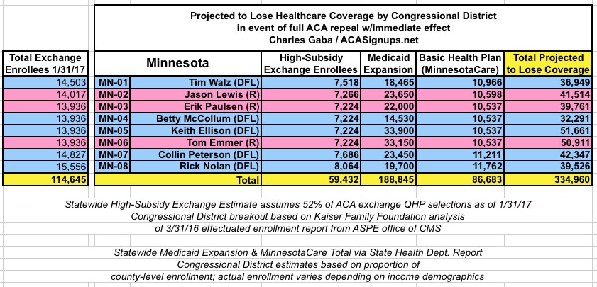 The amazing thing is that the grand total number losing their coverage would be virtually identical in either scenario! The numbers vary widely from state to state and district to district, but when you add it all up, it still comes in at around 24 million people either way!