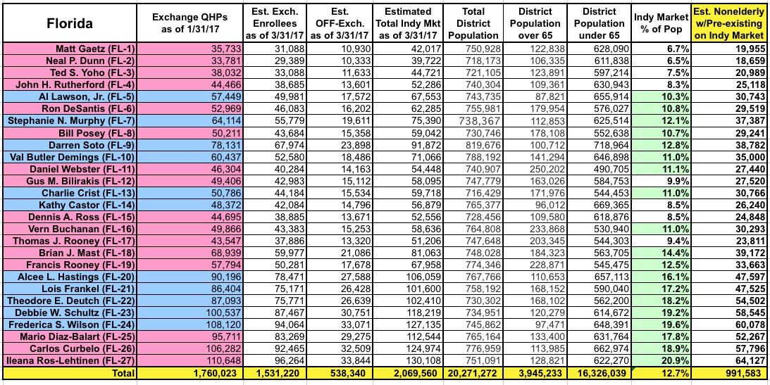 UPDATE 4/15/17: All 50 states are now completed, and I can state definitively that Florida's individual insurance market is unique across the country. Out of 435 Congressional Districts, only 32 are higher than 10%...19 of which are in Florida. Only 8 are higher than 15%...all of which are in Florida. In fact, the 11 highest-percentage districts are all in Florida.