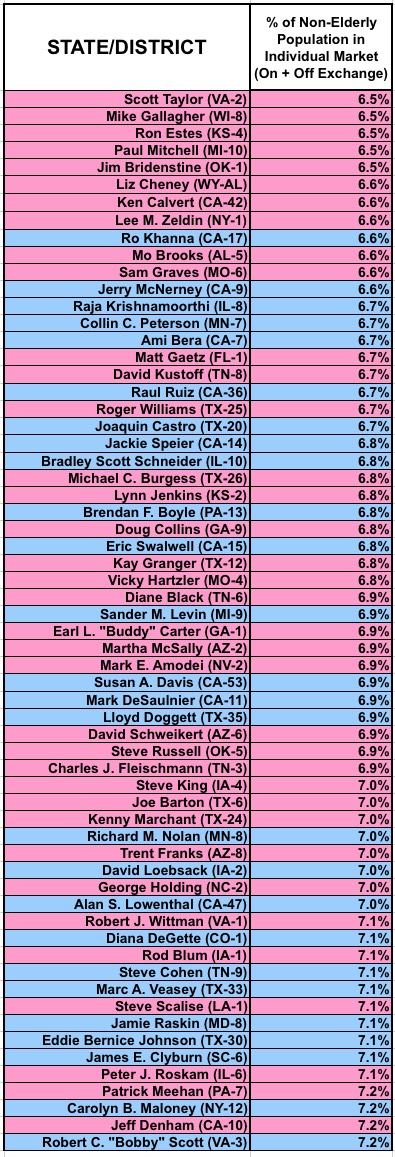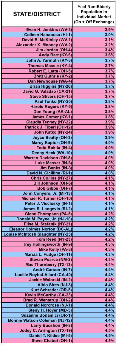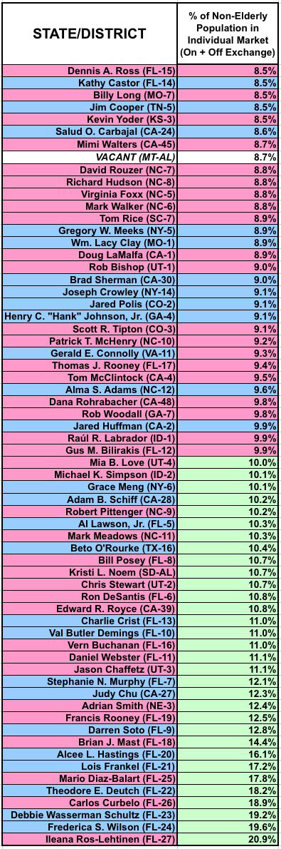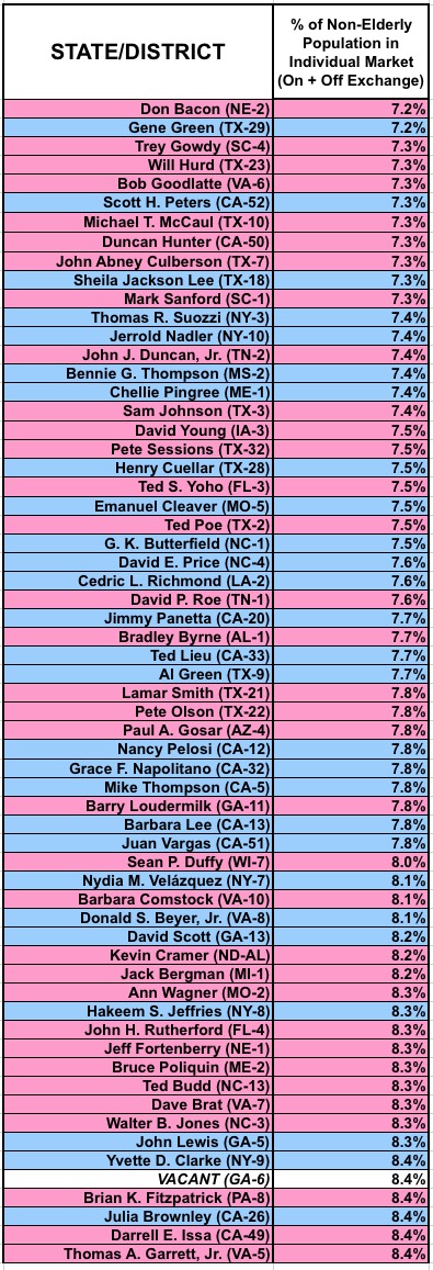 In additon to color-coding their data by the political party of each District's Representative, I'm also adding my own spin on the data: Estimates of how many people currently enrolled in the individual market suffer from "pre-existing conditions" which would likely mean them either being denied coverage altogether if the ACA's Guaranteed Issue, Essential Health Benefits and Community Rating provisions were to be stripped (Alternately, these people would charged massively higher rates to the point of likely not being able to afford the policy).