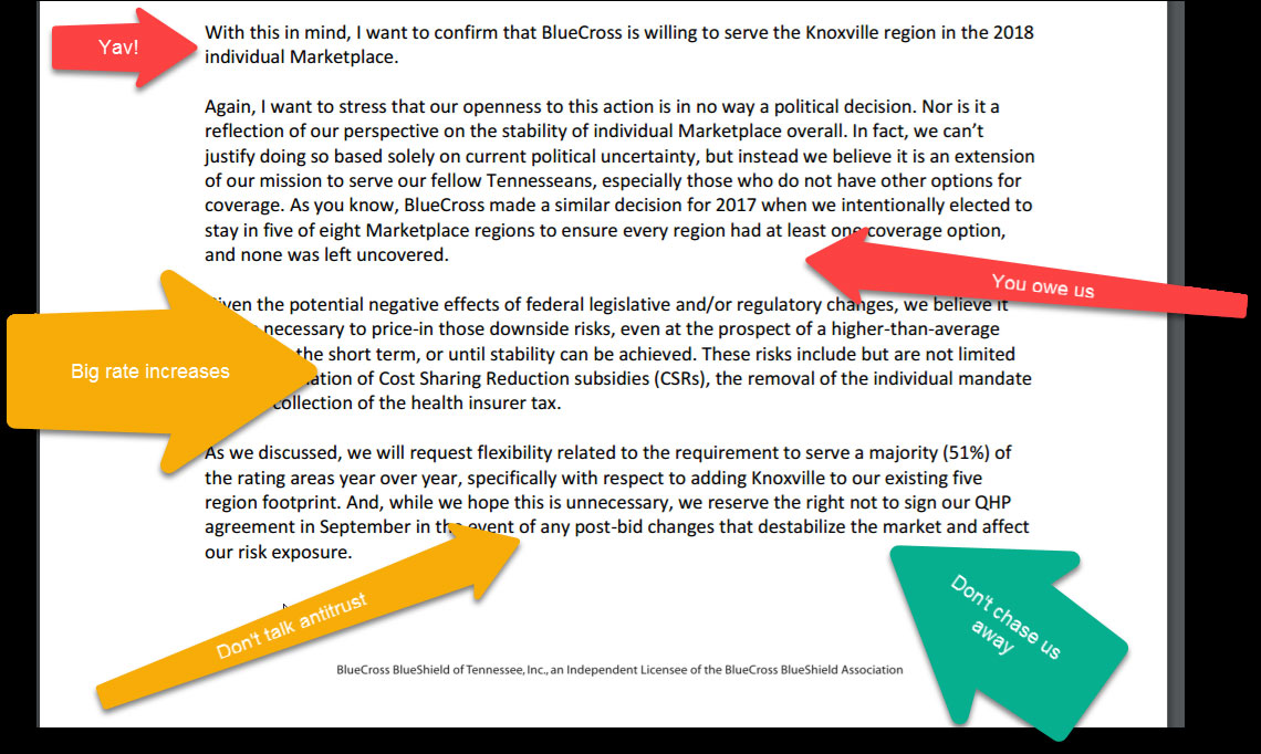 We appreciate getting to meet with you and your team yesterday to update you on BlueCross’s position relative to the individual Marketplace for Tennessee as the first deadline for 2018 approaches.