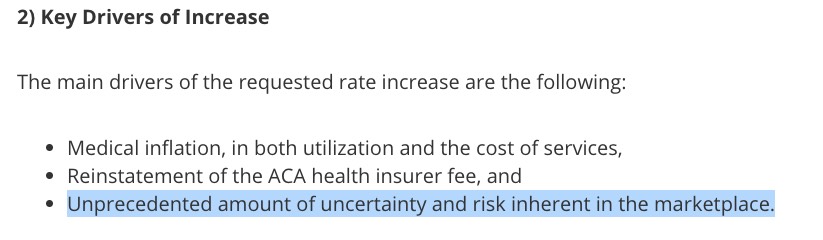 Interestingly, while Medica's rate filing letter clearly states that the 16.9% request assumes CSR payments will be made and the mandate will be enforced, they also list "unprecedented uncertainty/risk inherent in the marketplace" as one of the key drivers of the increase.
