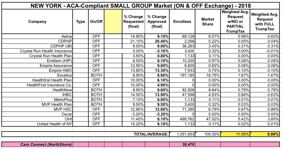 Also, msf3 notes that I misread CareConnect's small group request: I was looking at Aetna instead of CareConnect. CareConnect actually requested a 19.3% increase but was only approved for a 15.5% hike for small group plans, and holds a 7.3% market share, so this does impact the small group market in a similar fashion, knocking the statewide average down a bit from 9.3% to 9.0%: