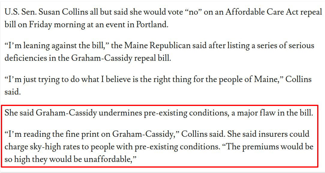 Big: GOP Senator Susan Collins confirms Graham-Cassidy would gut protections for pre-existing conditions:https://t.co/WXsJ1cIx5E pic.twitter.com/N5ayEFsEj1