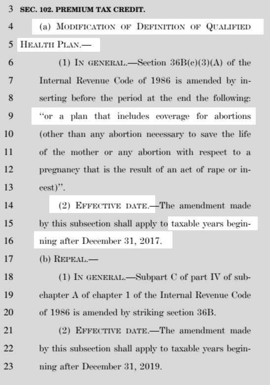 - Starting in 2018, amends IRC Section 45R to indicate that the term “qualified health plan” does not include any health plan that includes coverage for abortions, except abortions necessary to save the life of a mother or abortions for pregnancies that are a result of rape or incest.