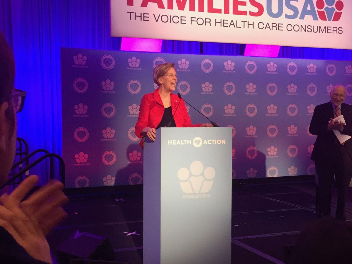 The official keynote speaker of the event was Sen. Elizabeth Warren. Her style is, from my view, sort of a hybrid of Hillary Clinton and Bernie Sanders--a cross between Hillary's wonkishness and Bernie's populist rhetoric. It was pretty good overall, and I especially liked her championing an idea which Andrew Sprung (Xpostfactoid) and I have been talking about for years: Tying MCO and Medicaid Advantage contracts to ACA exchange participation. She also made a very welcome clarification by stating that while she did endorse Bernie Sanders' "Medicare for All (even tho it's not actually Medicare)" plan, she's also open to any number of alternative plans, such as Sen. Brian Schatz's Medicaid Buy-In plan and so forth.