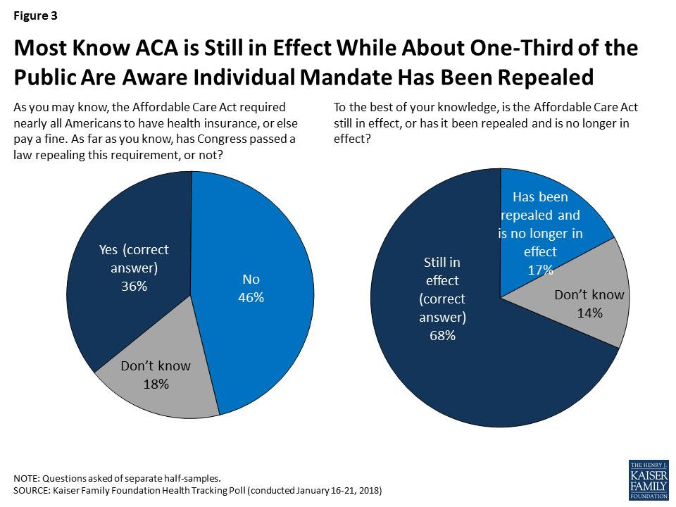 On the other hand, a majority of the public (68 percent) are aware that the ACA is still in effect, while one in five (17 percent) say it has been repealed and is no longer in effect and 14 percent are unsure.