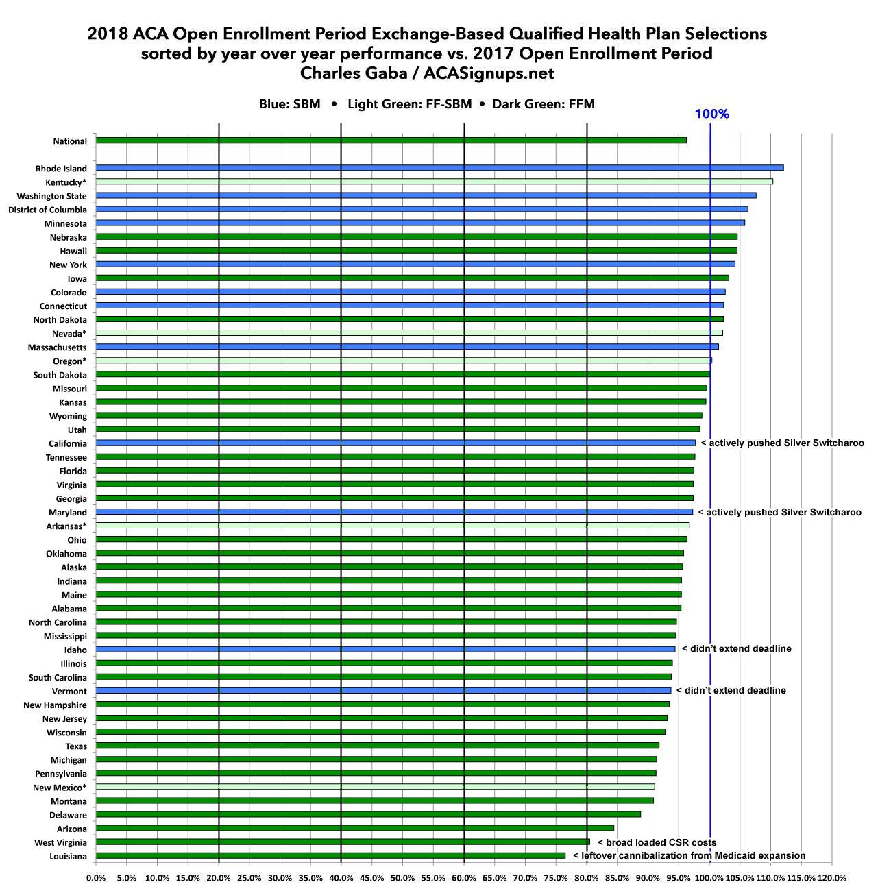 At the opposite end of the spectrum, as I've discussed before, Louisiana's "poor" performance year over year appears to be partly due to a leftover chunk of Medicaid expansion enrollees still siphoning off people who would otherwise be enrolled in exchange policies (I had previously thought that was limited to 2017, but it appears perhaps 2/3 of the 33K drop this year was due to folks shifting over to Medicaid as well).