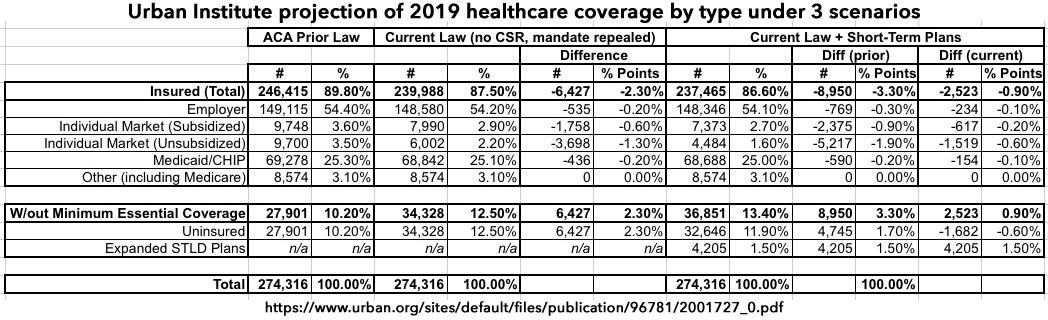 Under the Short-Term Plan scenario, they foresee subsidized enrollment dropping by over 600,000 more people and unsubsidized dropping by 1.5 million, along with small additional drops in emloyer and Medicaid coverage, for a net increase in the uninsured of around 2.5 million more people next year on top of the 6.4 million which they believe current Trump/GOP sabotage efforts will have caused by 2019.