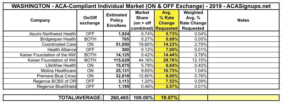 The Washington Insurance Dept. did the grunt work for me by listing all of the carriers and their average rate requests in a nice neat table, although the weighted average I get doesn't quite match up with theirs (they say it's 19.08%; I get 18.47%...and I seem to be missing nearly 22,000 enrollees in my tally; I'll double-check to see if I can find the discrepancy):