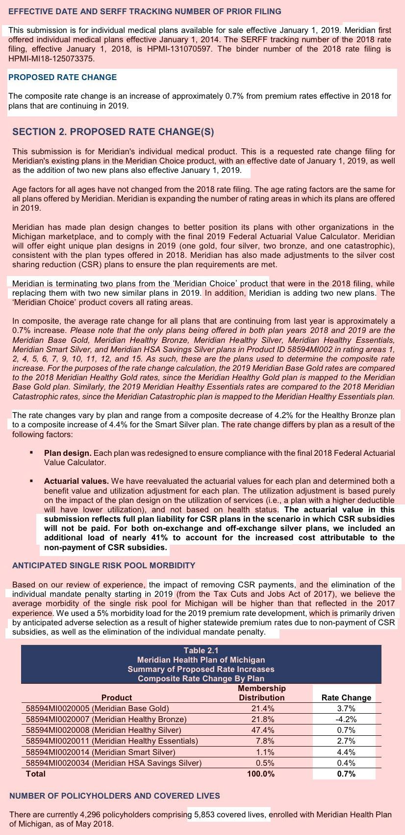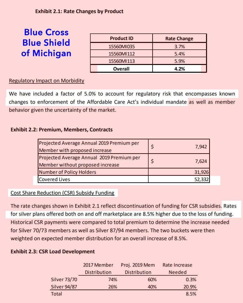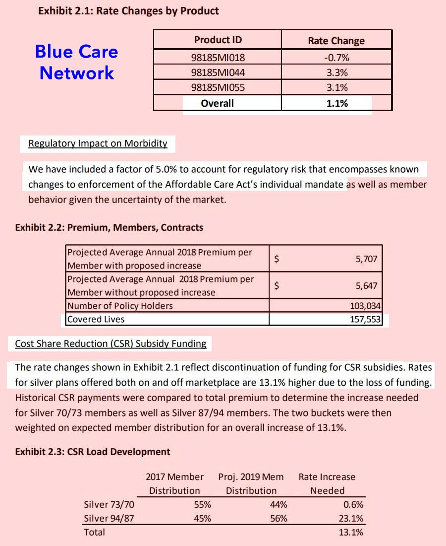 One thing I find very interesting is that Blue Cross, Blue Care Network and Meridian Health Plan, which comprise around 77% of the total individual market, made a point of mentioning the CSR load factor due to last year's sabotage efforts by Donald Trump. In summary: