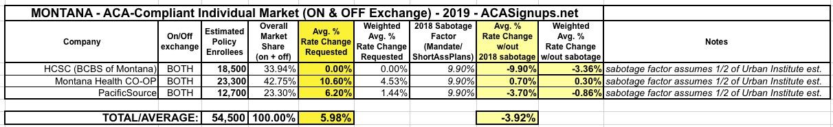Normally, in the absence of hard sabotage data from the carriers themselves or from the state insurance department, I've been using the "2/3 rule of thumb"...taking the Urban Institute projection for each state from March and lopping 1/3 off the total to err on the side of caution. In the case of Montana, however, given the quote from the CEO of the carrier with the largest market share (around 43%), I'm going to assume just half of the Urban Institute number, so I'll go with ~9.9% instead of 19.8%.