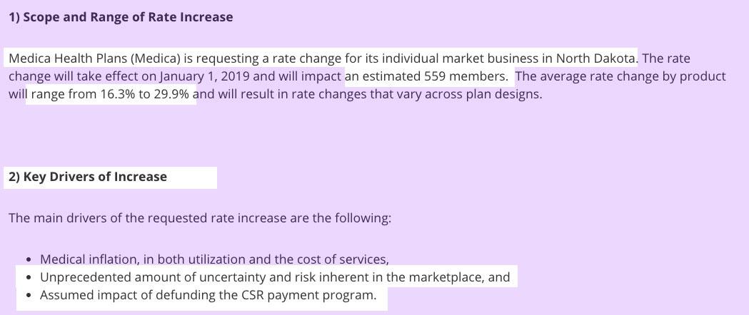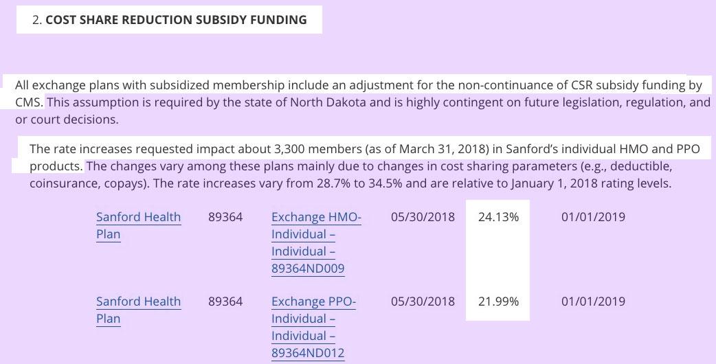 ...which, as it happens, is almost exactly the same amount that both Medica and Sanford Health plans are asking to raise their rates next year, which I'm sure is no coincidence. Note that all three carriers specifically call out the CSR factor in their filings.