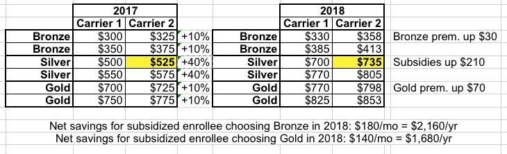 This is a simplified example, but it illustrates how several million subsidized enrollees saved big by choosing dirt-cheap Bronze or bargain-priced Gold policies. Carrier 2 has the 2nd lowest-priced Silver plan, which ACA tax credits are based on regardless of which policy the person actually enrolls in. Bronze and Gold premiums for both carriers only increased 10%, while SIlver premiums increased 40% to make up for the lost CSR revenue...but that also means tax credits increased around 40% as well.