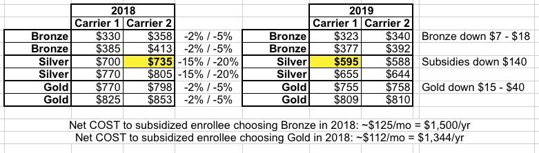 As you can see, if the subsidized enrollee chose a Gold plan in 2018, they'll likely pay almost exactly the same in 2019 as well...their net premium may even drop a buck or two more per month. However, if they chose a Bronze plan, they'll pay around $8 more per month, since their subsidies dropped by more than their premium did. Annoying, but not devastating.