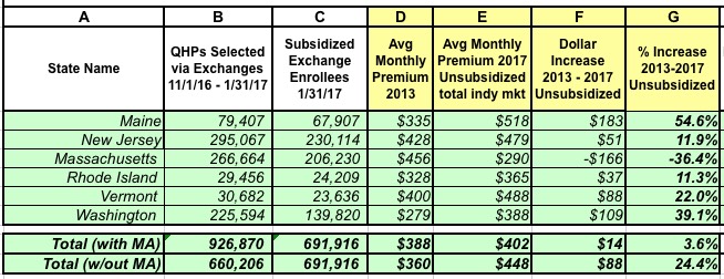 Unfortunately, I still haven't dug up the 2017 average premiums for California, DC or New York yet (although I have more on New York below).