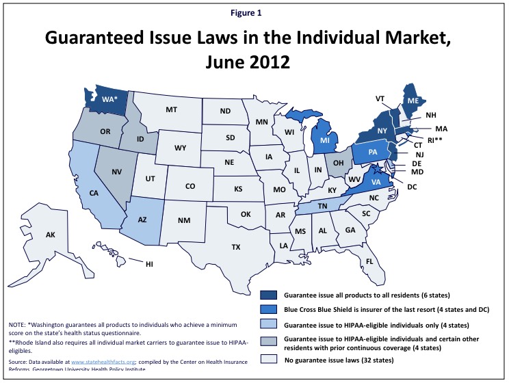 - In five states (Maine, Massachusetts, New Jersey, New York, and Vermont), individual market insurers are required to guarantee issue all products to all residents. A sixth state, Washington, requires guaranteed issue to individuals who achieve a minimum score on the state's health status questionnaire.