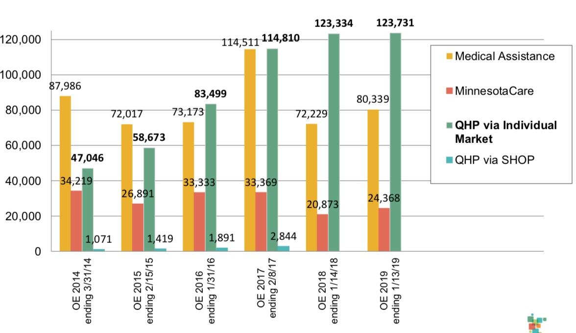 The Minnesota ACA exchange, MNsure, wrapped up their 2019 Open Enrollment Period on January 13th, and recently released three big reports chock full of wonky healthcare data nerd goodness. I'm mostly going to just repost some of the key graphs/charts, but make sure to read the full reports for all the details: