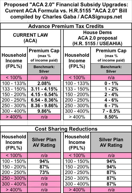 Here's how the financial subsidy formulas would change under H.R.5155 vs. the current formula. Remember, "APTC" subsidies reduce premiums; "CSR" subsidies reduce deductibles, co-pays and coinsurance (out of pocket expenses):