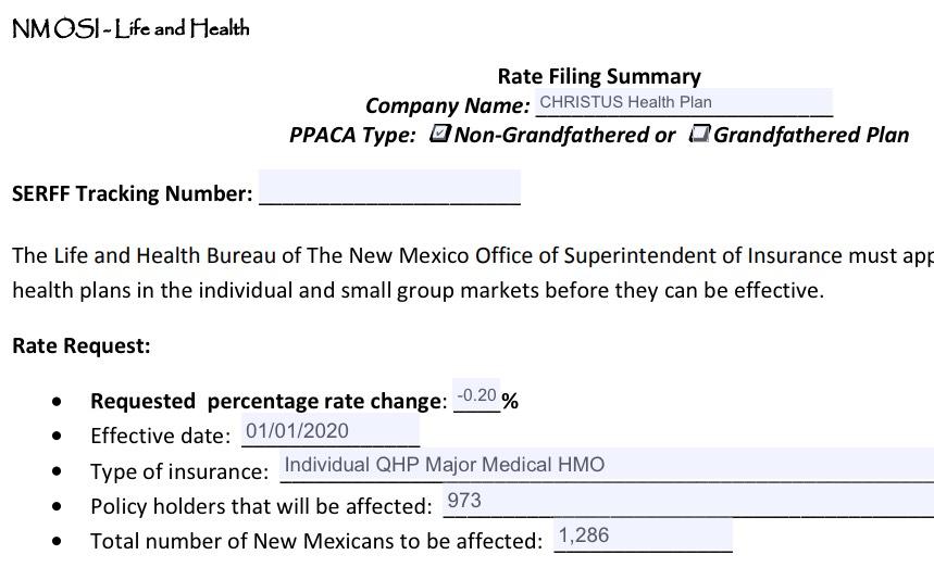 The New Mexico Office of the Superintendent of Insurance website just posted the preliminary 2020 insurance rate filings. Here's the full list, which includes a mish-mash of Individual Market, Large Group and Small Group Market policies, with a Pediatric Dental standalone plan thrown in as well.