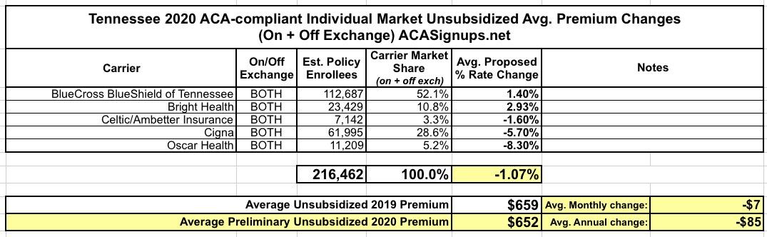 Tennessee: PRELIMINARY avg. 2020 #ACA exchange premiums: 1.1% DECREASE; BCBSTN expanding coverage areas