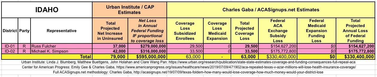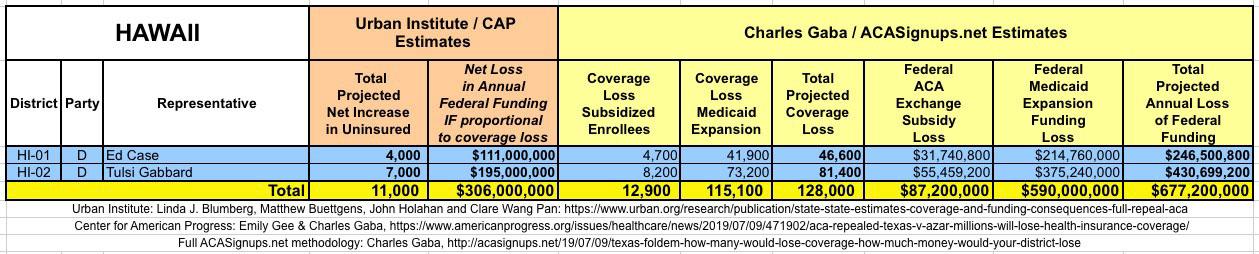The Urban/CAP numbers are probably more accurate, but mine have one advantage: I've broken out both the coverage losses and funding losses by category (Individual Exchange Market/BHP and Medicaid Expansion). In addition, I've color-coded the Congressional Districts by which party each U.S. Representative is a member of.