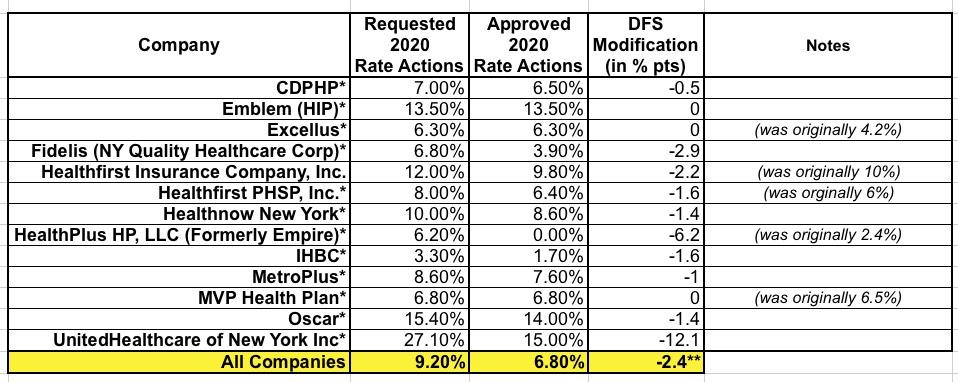 Back on May 31st, I reported that New York's Dept. of Financial Services had released the preliminary, requested premium rate hikes for the 2020 ACA individual and small group markets. At the time, the weighted average increase requested state-wide was around 8.4% (although I got 8.3% when I plugged the hard enrollment numbers into a spreadsheet).