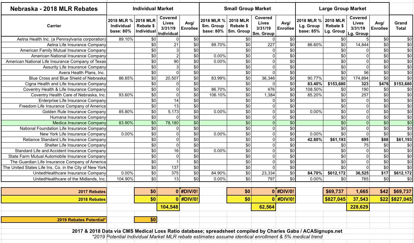 Things are looking pretty quiet in the Cornhusker State...no MLRs in either the Individual or Small Group markets, and only $827,000 for Large Group enrollees...averaging just $22 apiece. Next year looks equally dull so far: