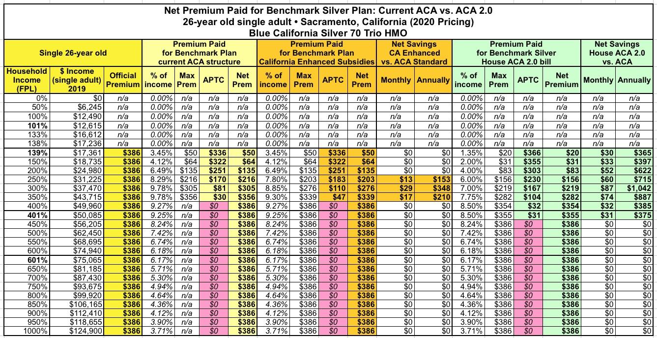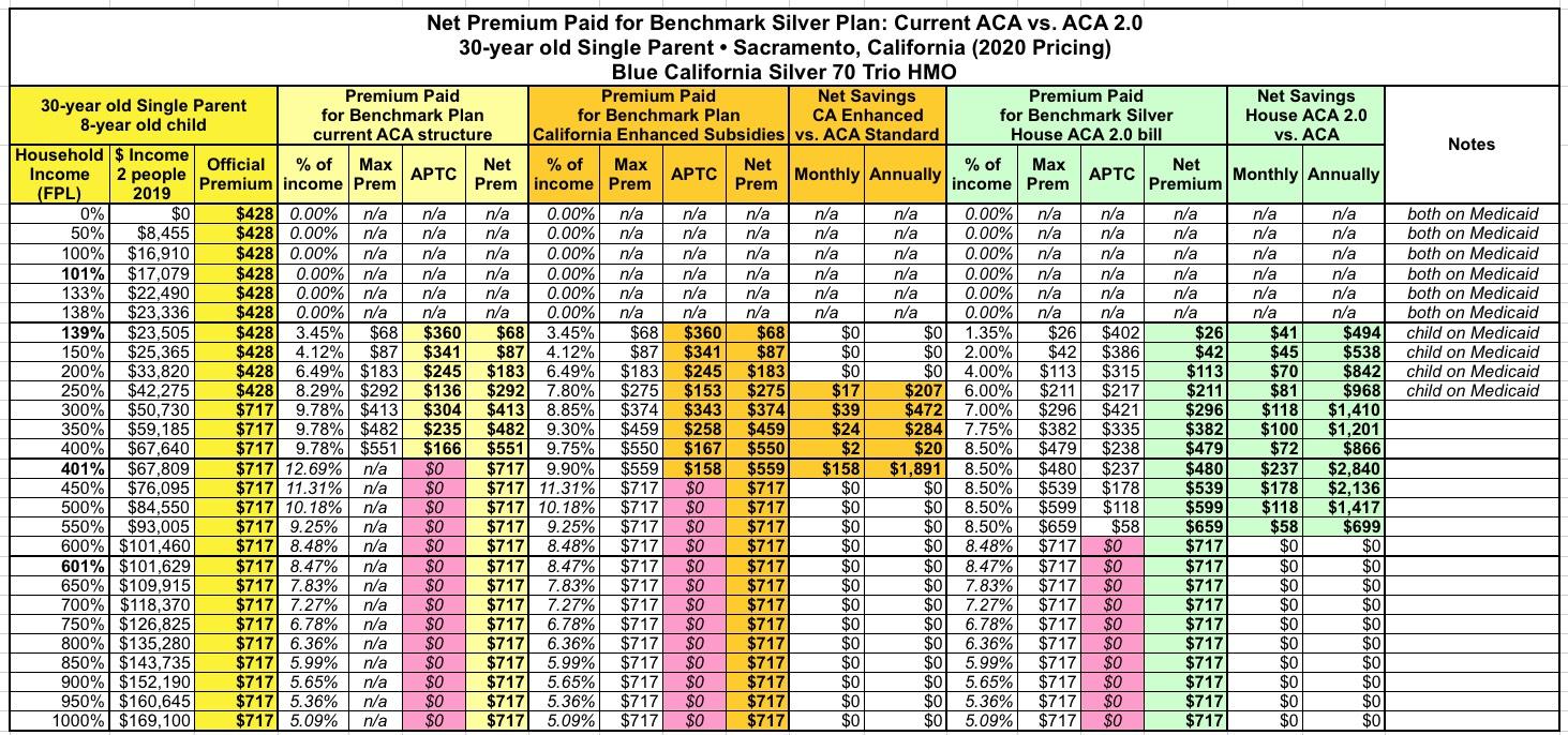 I've also included a third overlay on the tables below: The federal House Democrats ACA 2.0 bill (either H.R. 1868 or H.R. 1884), which would cap premiums at no more than 8.5% of income. The official ACA formula is in Manilla; the California subsidy formula is in Orange, and the proposed ACA 2.0 structure is in Green.