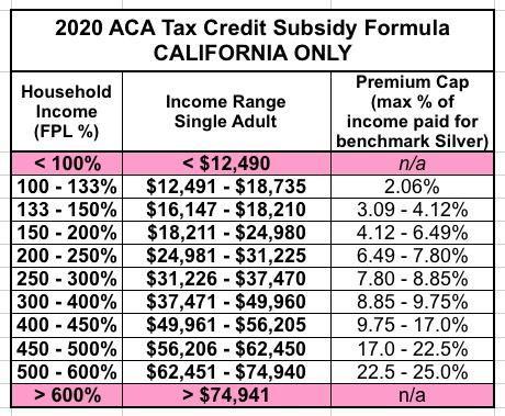 Until now, only CoveredCA enrollees earning 138-400% of the Federal Poverty Line were eligible for ACA financial assistance. Starting in 2020, however, enrollees earning 400-600% FPL may be eligible as well (around $50K - $75K/year if you're single, or $100K - $150K for a family of four). In addition, those earning 200-400% FPL will see their ACA subsidies enhanced a bit.