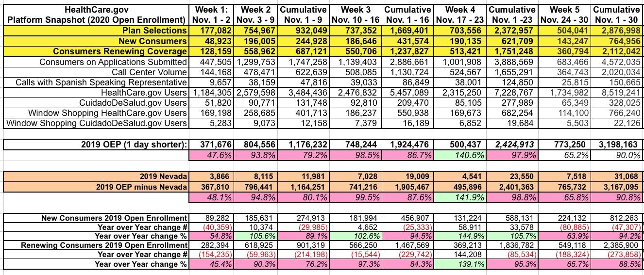 In week five of the 2020 Open Enrollment, 504,041 people selected plans using the HealthCare.gov platform. As in past years, enrollment weeks are measured Sunday through Saturday. Consequently, the cumulative totals reported in this snapshot reflect one fewer day than last year.