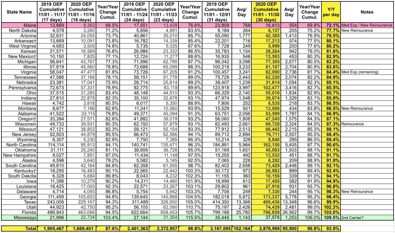 Mississippi continues to be the top performer vs. last year, running nearly 10% ahead of last year on a per-day average, while Maine continues to be the worst-performing, mainly (hah!) due to their Medicaid expansion. Medicaid expansion is also likely the cause of at least a small part of Virginia's drop, as they didn't complete transferring low-income exchange enrollees over last year to my knowledge.