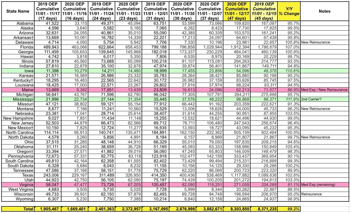 Here's the week by week breakout across all 38 states. I've also compared the 2020 Open Enrollment numbers against the 2019 data, and have even accounted for the fact that Nevada split off onto their own state-based exchange this year: