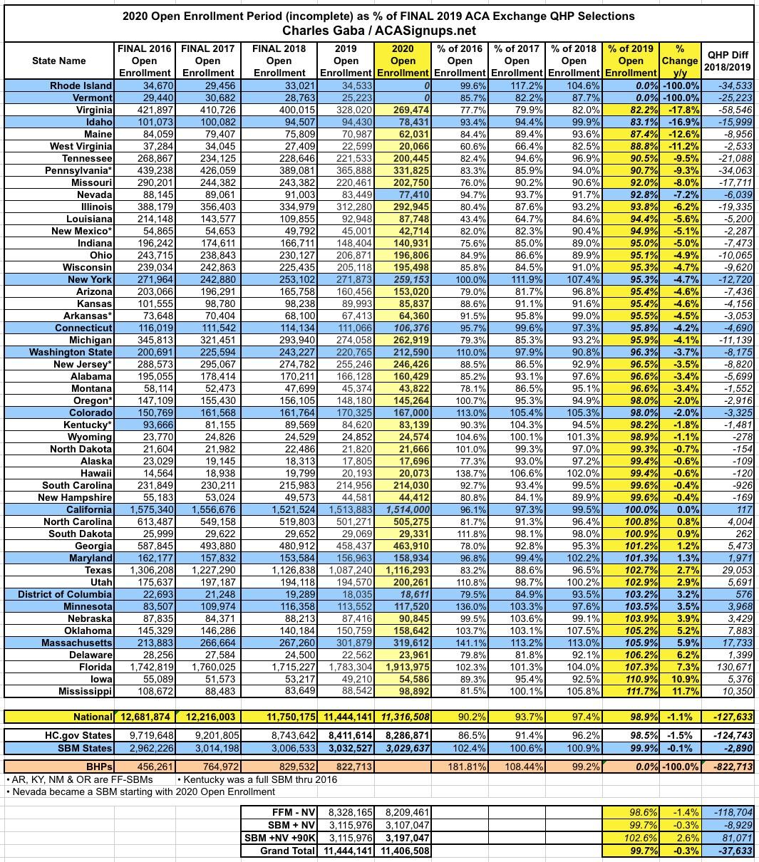California and New York have both released updated 2020 Open Enrollment numbers, so I figured I'd update my spreadsheet one more time before the final data is released. This time I've included a smaller secondary table at the bottom which adjusts the Federal and State-based exchange numbers for Nevada.