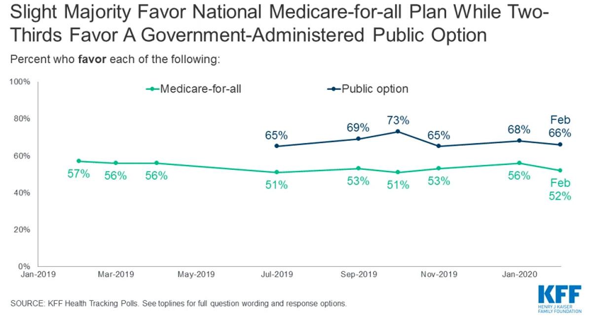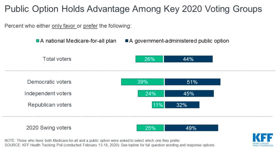 - Both a national Medicare-for-all plan and a government-administered public option continue to garner majority support in the KFF Health Tracking Polls, including large shares of Democrats who express positive attitudes towards both proposals. Yet, the public option holds the advantage over a national Medicare-for-all plan when supporters of both are forced to choose one. The public option garners more support among many key groups in the 2020 Democratic primary including swing voters (49% v. 25%).