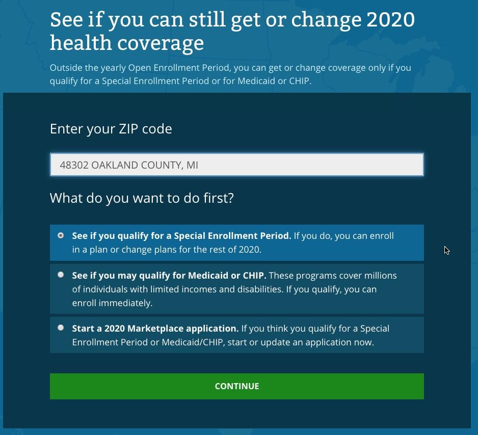 I don't actually see anything in the text above which clarifies anything regarding "flexibility on documentation". I'm not entirely sure what it means...does it mean a simple written explanation like Idaho is allowing? Here's the screens you'll see when you check to see whether you qualify for a Special Enrollment Period. The first three look mostly the same...