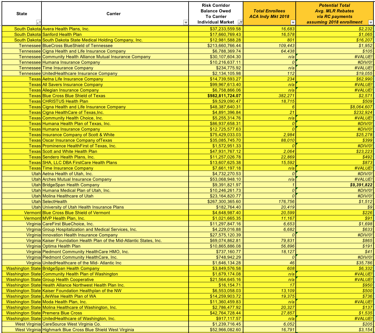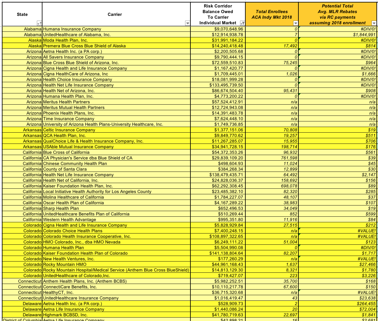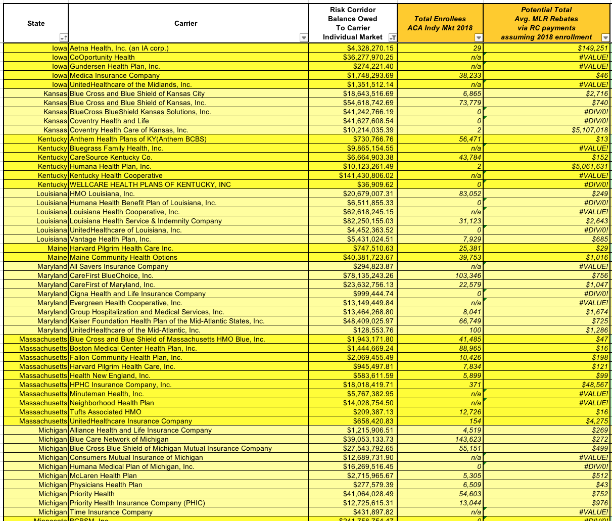(At the opposite end of the spectrum, as I mentioned earlier, is CareFirst BlueChoice of DC, which is only owed $15,000...and they had 4,400 enrollees in 2018, which means that assuming a similar enrollment this year, each one would likely only receive $3....spread out over 3 years. Enjoy that $1/year, folks!)