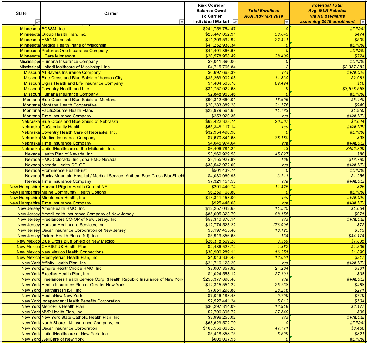 In some cases you'll note that the number of enrollees is shown as either "0" or "n/a". Zero means they didn't have anyone enrolled in 2018, likely because they had left the market in that state between 2016 and 2019. "n/a" means that the carrier isn't listed in the 2018 MLR files at all--as I noted above, some went out of business or merged with/were bought out by other carriers.
