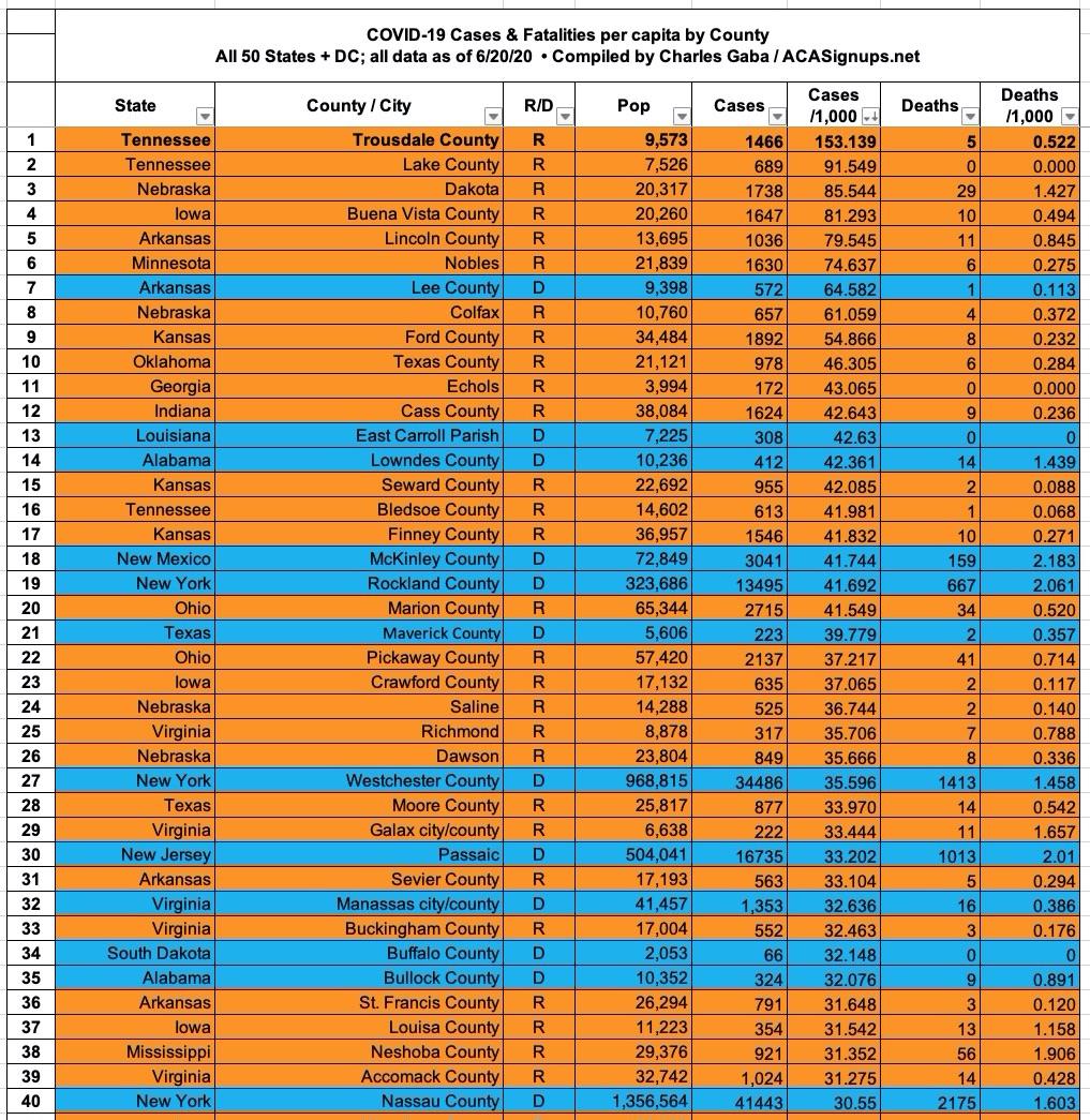 Here's the top 40 counties ranked by per capita COVID-19 cases as of Saturday, June 20th: