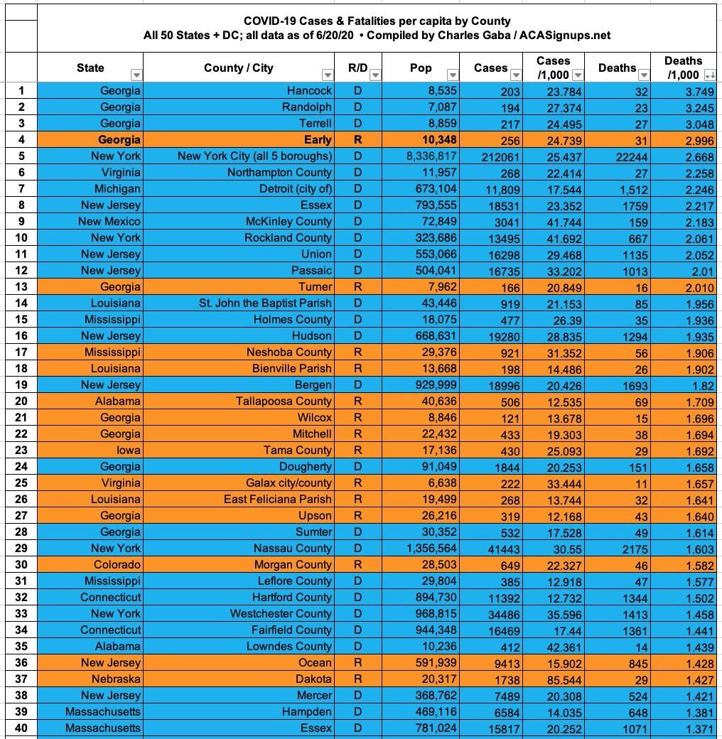 Here's the top 40 counties ranked by per capita COVID-19 fatalities as of Sunday, June 20th: