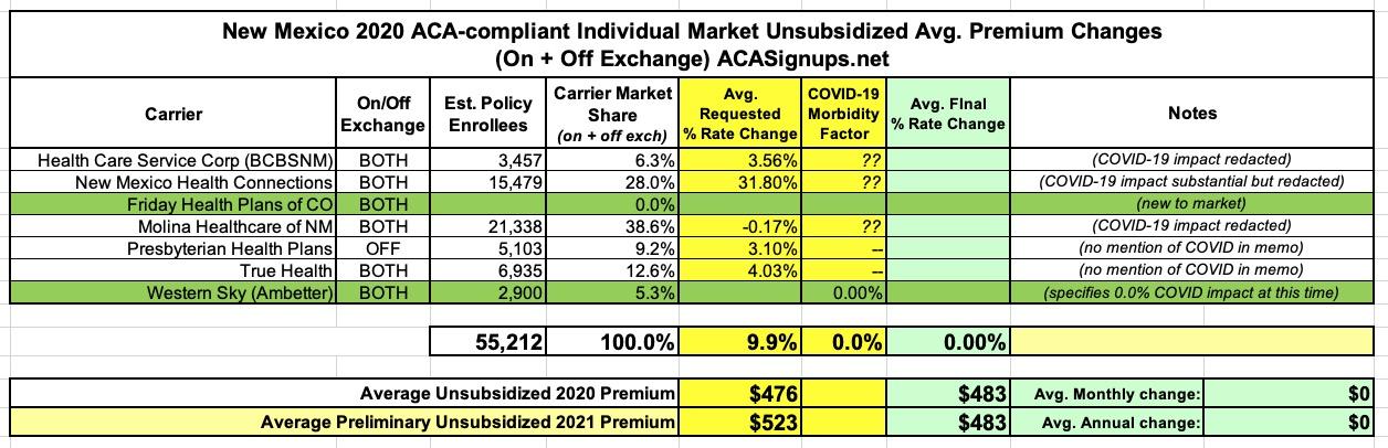 - Third, there's almost zero information available about the impact of the COVID-19 pandemic on New Mexico's premiums because three of the seven carriers have redacted their actuarial memos, blacking out any discussion of it, and two more don't mention COVID-19 at all in theirs. That leaves the two new entrants...one of which doesn't mention it, while the other states it as being 0.0% at this time. Sigh.