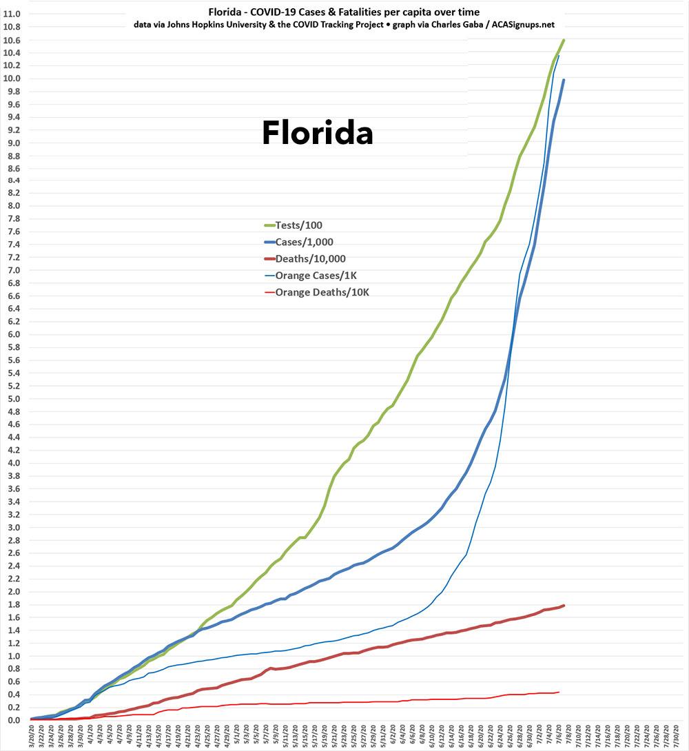 UPDATE 7/08: Some people have noted that the fatality line in Florida (and most of the other states which have seen surges in positive cases recently) has remained pretty much straight. On the one hand, that's good. On the other hand, aside from the fact that even many of those who aren't killed by COVID-19 still suffer greatly including potentially chronic health problems, there's also the little fact that deaths tend to lag diagnoses by a month or so...which means that massive upswing that you saw starting around the first week of June is now starting to show up in the ICU.