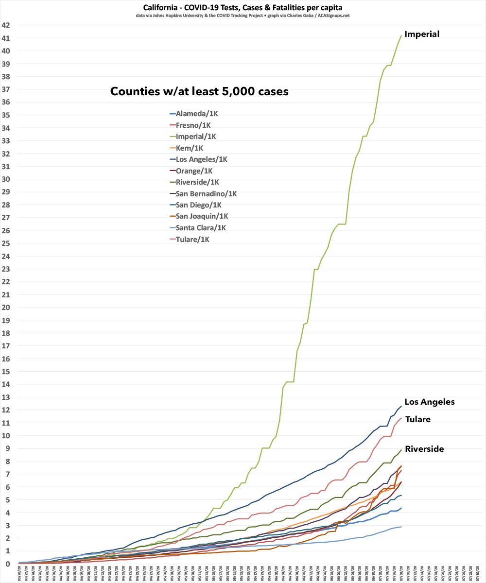 Well, California is a big state, of course (both population-wise and geographically), so I decided to take a look at the county-level rate of growth per capita. 58 counties makes for a nearly unreadable chart (see my 50-state weekly updates), so I decided to go with just 12: The 12 California counties with more than 5,000 confirmed cases of COVID-19 as of July 8th. These 12 counties also include over 83% of all California cases, so I'm not too concerned about the other 46 at the moment.