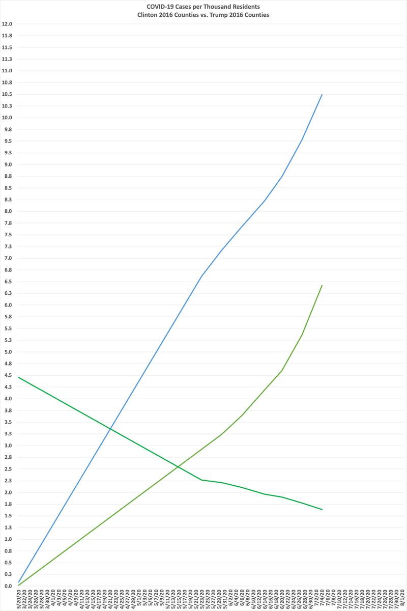 It's also worth noting how the ratio of per capita cases has shifted between the Clinton and Trump counties over time. Back in mid-March, the rate was 4.5x higher in Clinton-voting counties than Trump counties. As of this weekend that ratio was down to 1.6x.