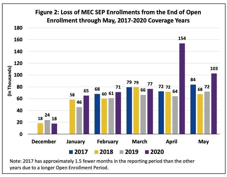 • By month, the largest gain in loss of MEC SEP enrollments occurred in April 2020, with enrollments increasing by 139 percent when compared to April 2019.