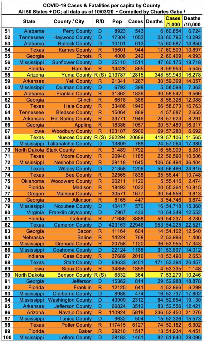 With these updates in mind, here's the top 100 counties ranked by per capita COVID-19 cases as of Saturday, October 3rd (click image for high-res version). Blue = Hillary Clinton won by more than 6 points; Orange = Donald Trump won by more than 6 points; Yellow = Swing District