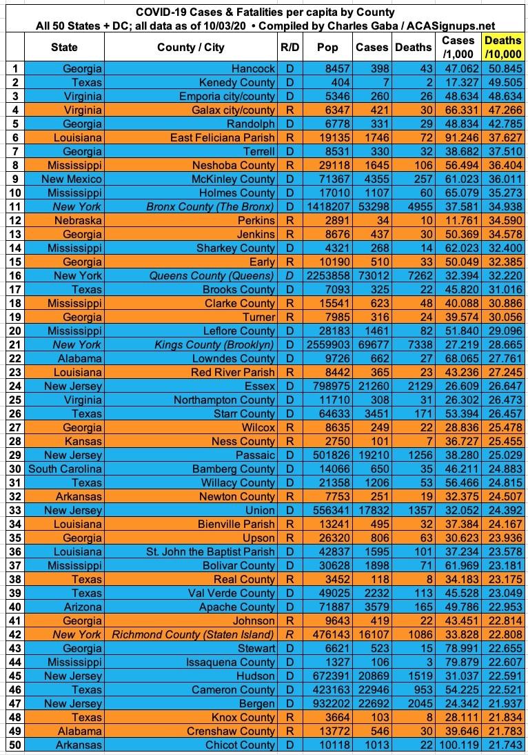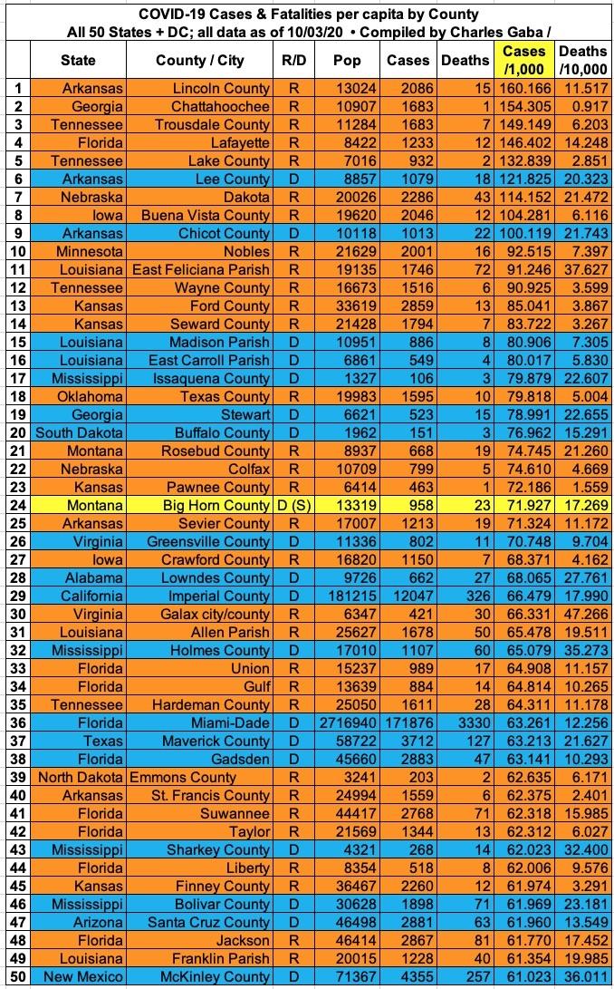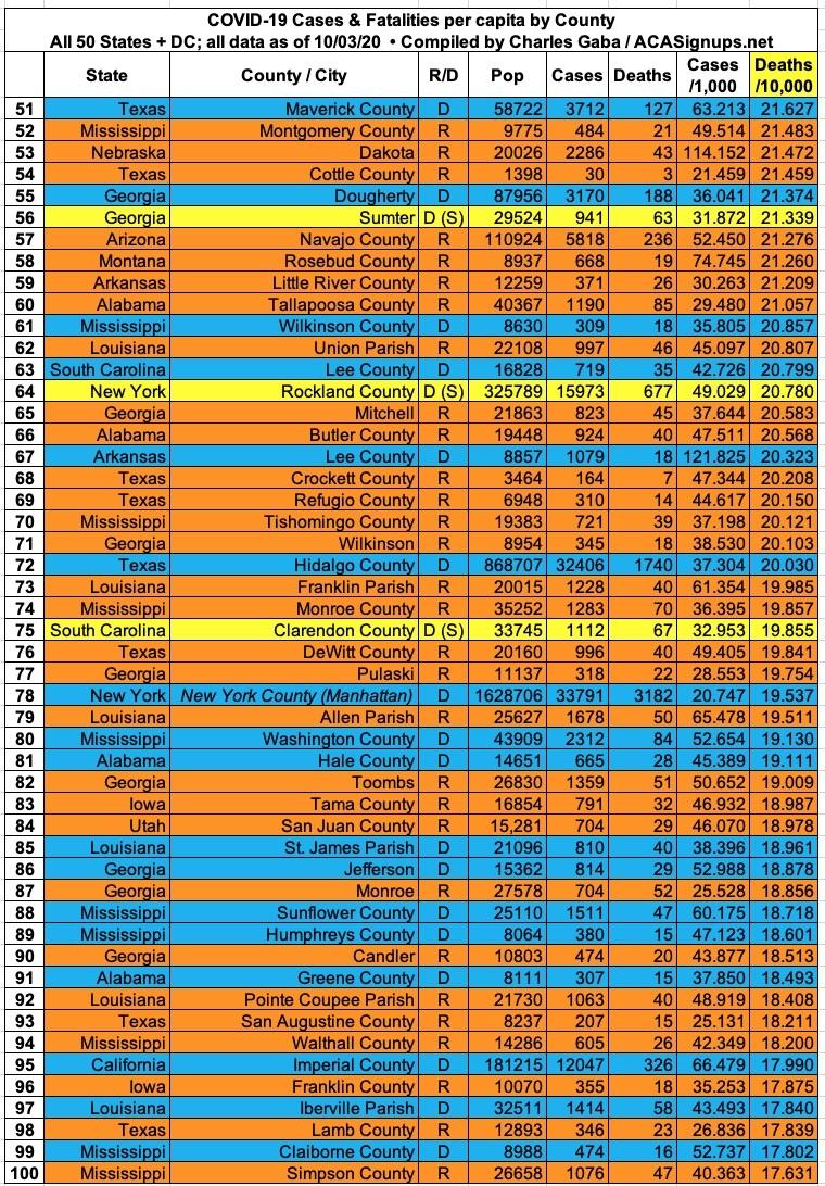 Here's the top 100 counties ranked by per capita COVID-19 fatalities as of Saturday, October 3rd (click image for high-res version):