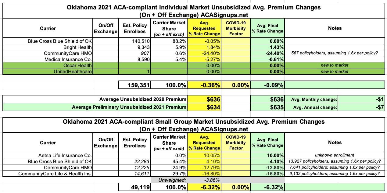 A month ago the Oklahoma Insurance Department posted the preliminary 2021 individual & small group market rate filings, including the following press release: